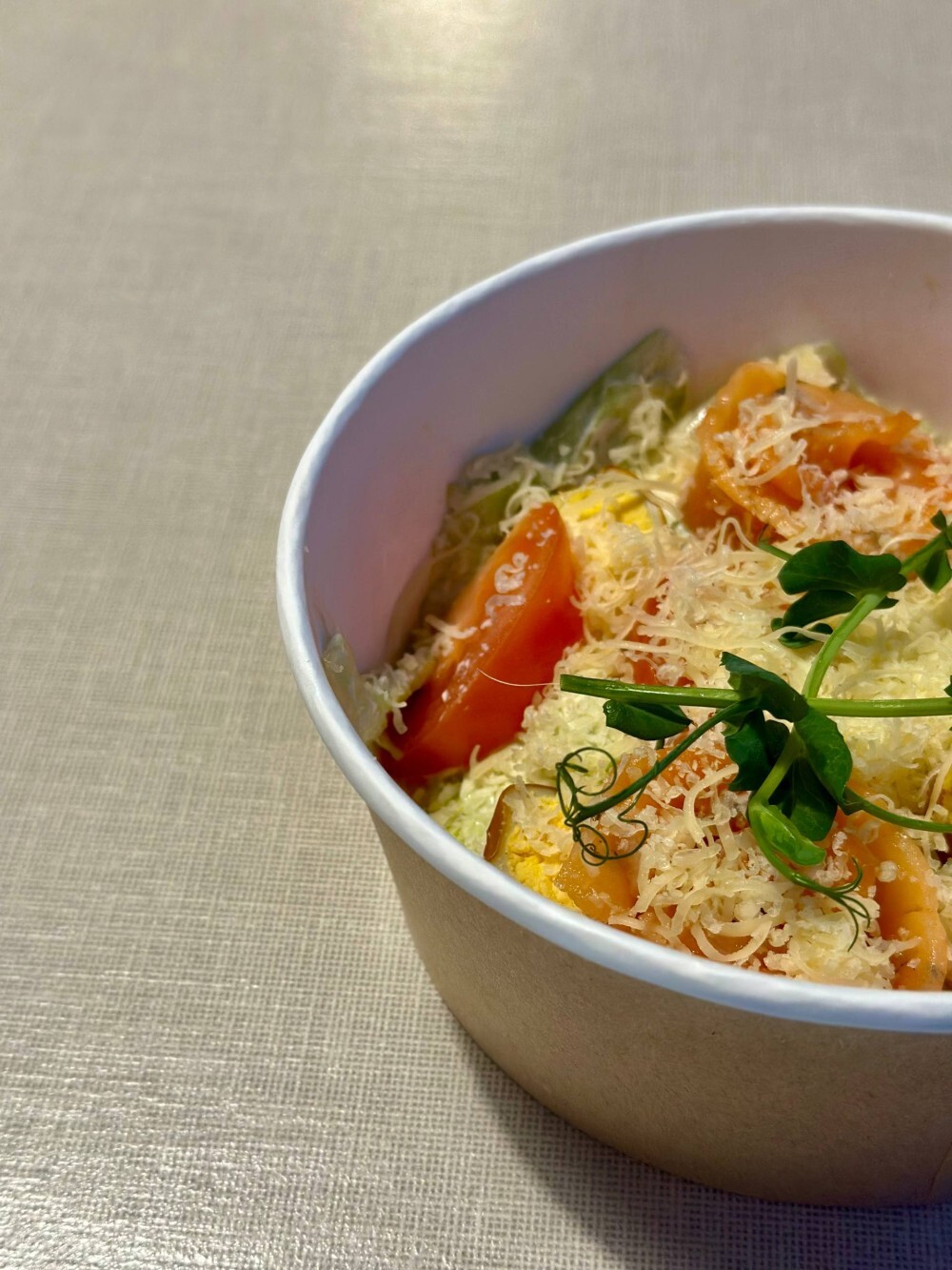 Салат с слабосоленой семгой, айсбергом и томатами. Подается с сыром Пармезан, яйцом, под соусом Цезарь