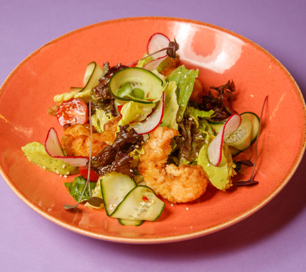 Айсберг, перец болгарский, томат, креветка Панко, соус из зелени, бальзамический соус, пармезан