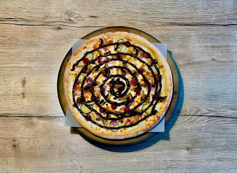 Сыр, колбаса, бекон, огурец, шампиньоны, соус ранч, соус барбекю