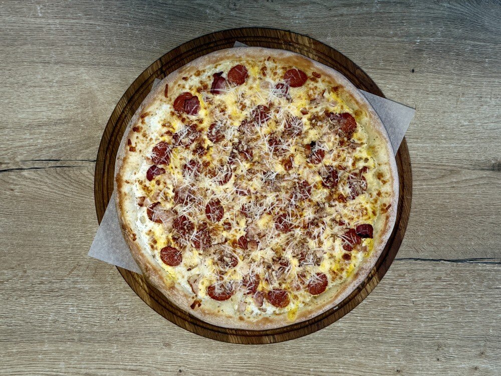 Соус ранч, сыр моцарелла, пепперони, копченая курица, бекон, соус сырный, Криспи, пармезан