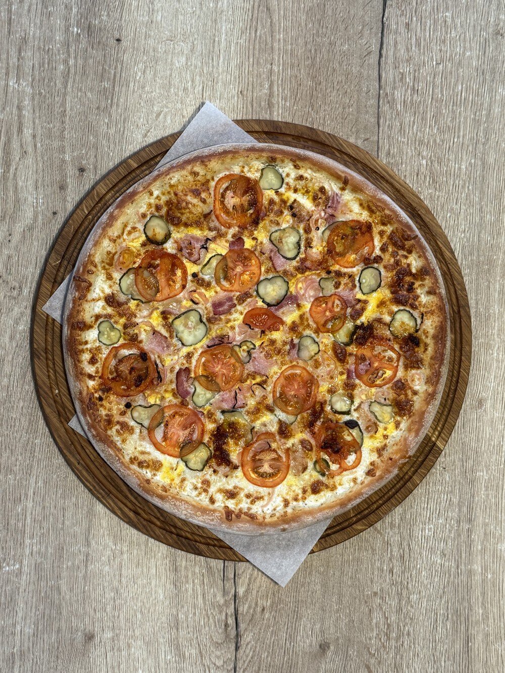Соус ранч, сыр моцарелла, сырный соус, грудинка в/к, соус болоньезе, томат, соленый огурец, лук маринованный